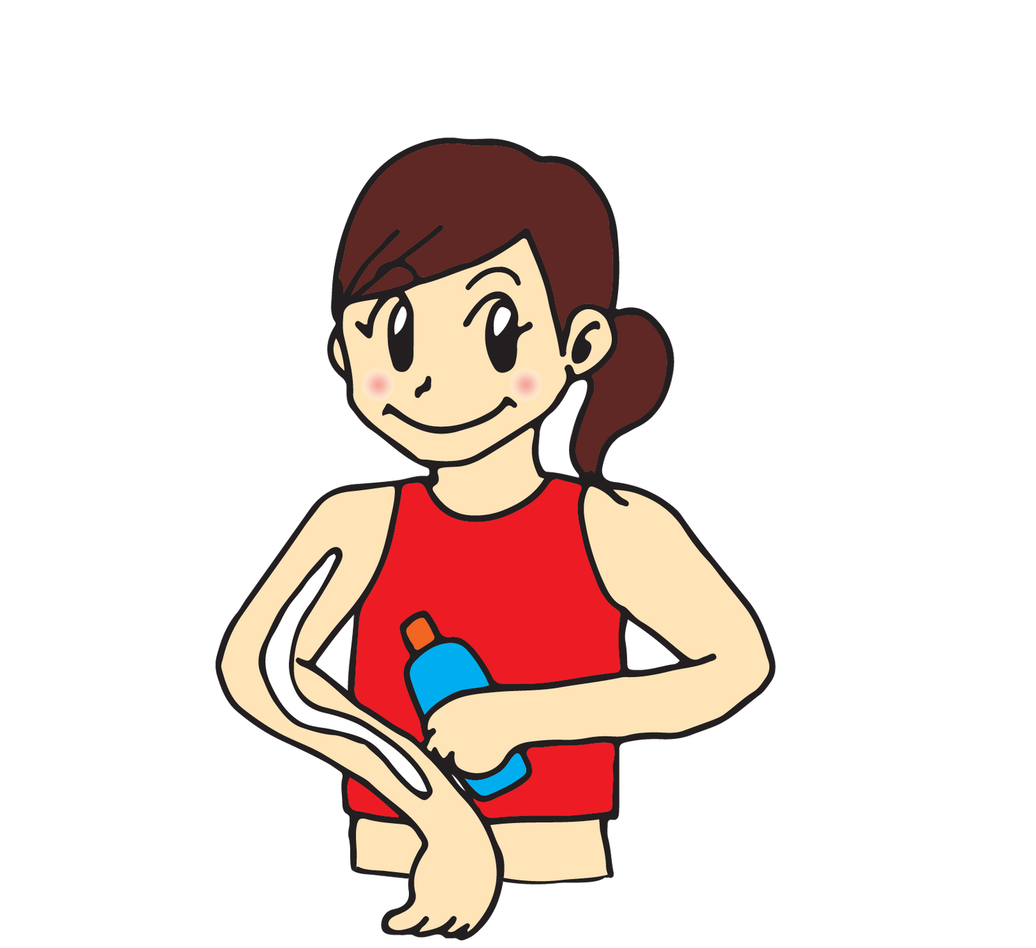 ② 透明になるまで手のひらでよくなじませます。すぐに海に入ってはいけません。全身に塗ったら10分以上乾かしましょう。